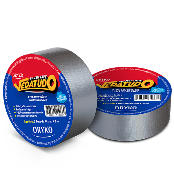 Fita multiúso autoadesiva na cor prata com filme de polietileno e estruturada com tecido de algodão, com adesivo à base de resina e borracha. Proporciona fácil rasgamento e boa conformabilidade. Fita resistente a água, com alta adesividade e boa resistência a ruptura, ideal para reparos provisórios, fixações diversas e manutenção em geral.