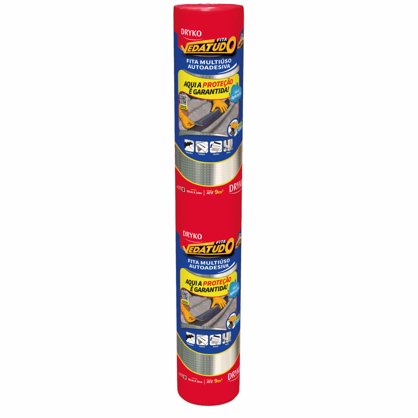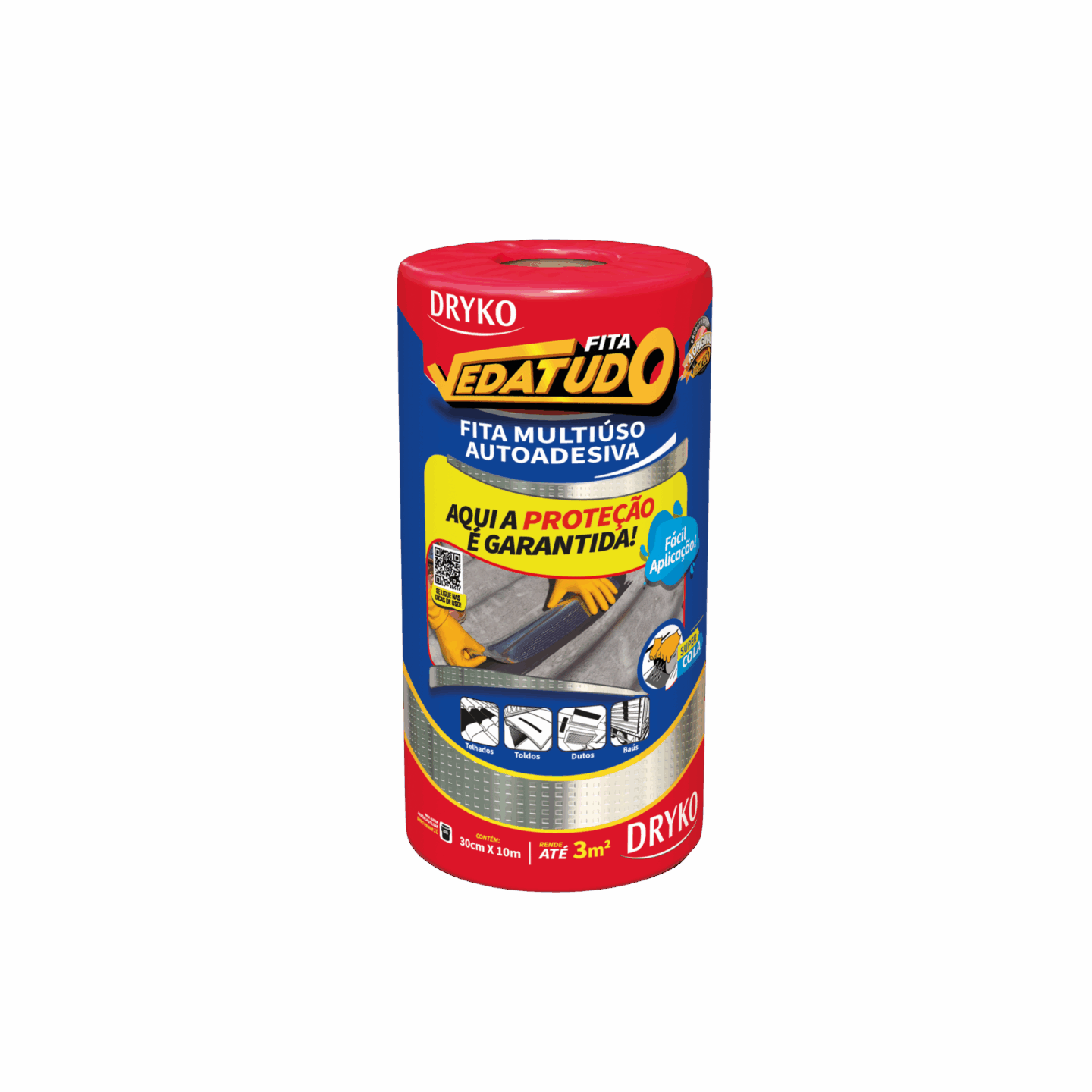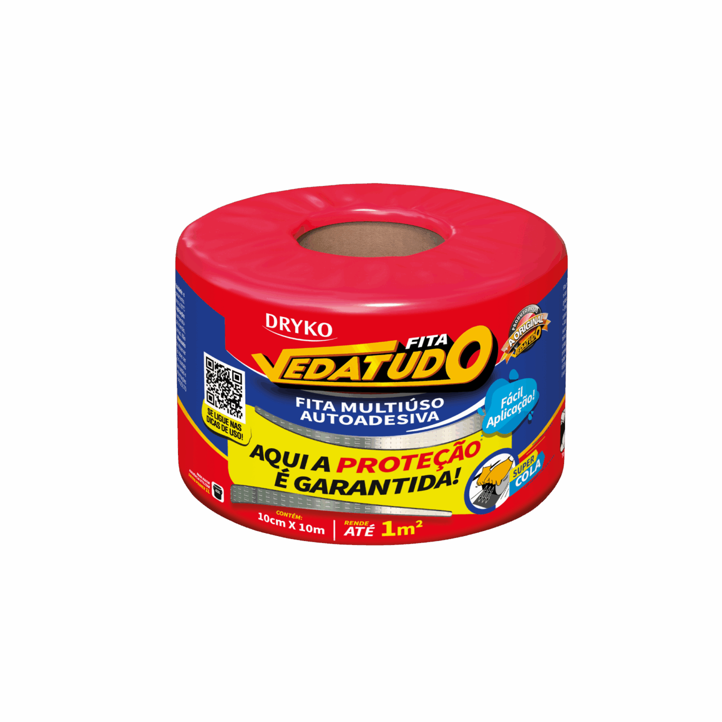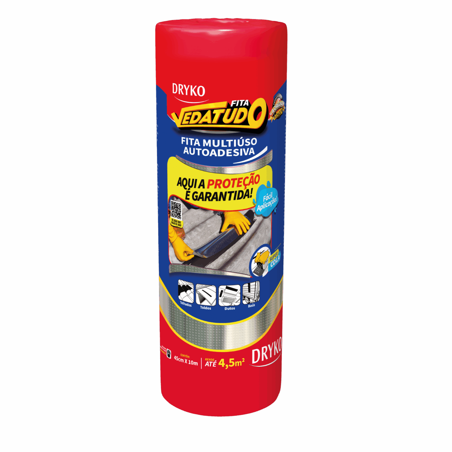 Fita autoadesiva multiuso à base de asfalto modificado, autoprotegida com filme de alumínio que permite sua exposição a intempéries e aos raios solares, sendo de fácil aplicação, na qual proporcionam medidas imediatas para solucionar problemas de gotejamento e vedações.